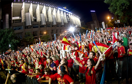 Y es curioso lo que la selección española de fútbol ha conseguido desde el año 2008, cuando ganó su primera Eurocopa. Antes todo había sido sequía en esas lides deportivas, pues no pasábamos de cuartos de final, “la maldición de cuartos” la llamaban. Pero desde que nos hemos convertido en una potencia del balompié, primero europea, hace cuatro años, y luego mundial, en 2010, la bandera ha cobrado otro sentido. Y ayer era ya una locura colectiva, una borrachera, un delirio vestido de rojo y amarillo, en casas, bares, calles, plazas.